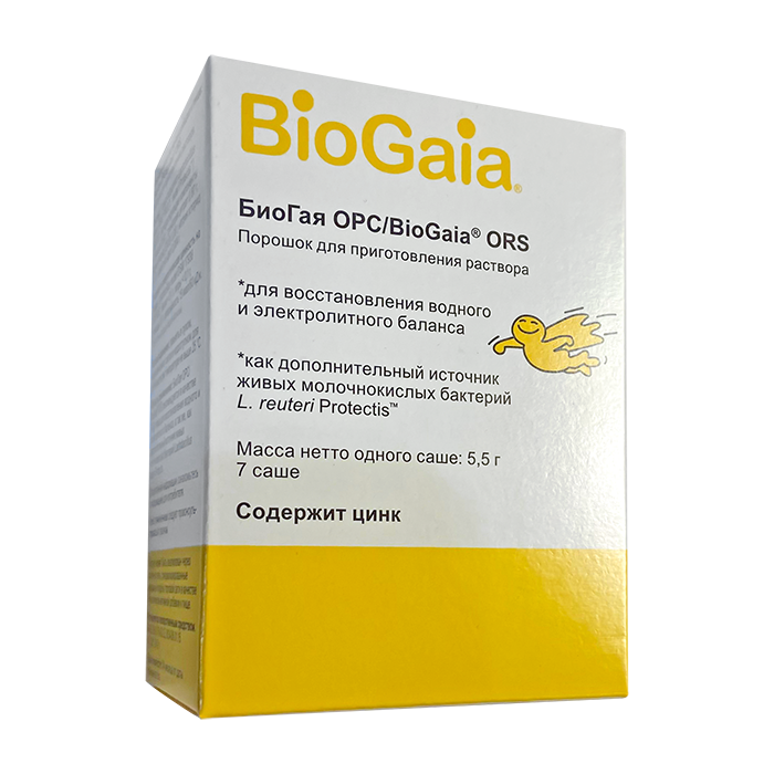 БиоГая ОРС / BioGaia® ORS – комбинация солей для оральной регидратации, цинка и пробиотика – рекомендуется в качестве БАД к пище для восстановления водного и электролитного баланса, а также как дополнительный источник живых молочнокислых бактерий Lactobacillus reuteriProtectis.