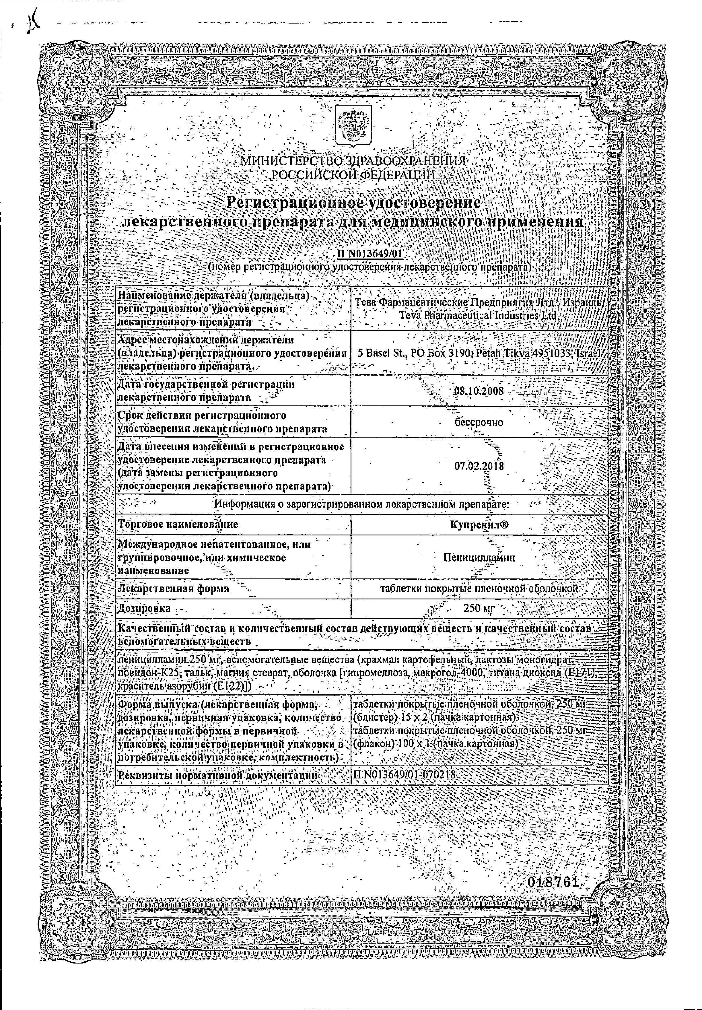 Применение. Таблетки Купренил следует принимать перед едой. Дозировку и кратность приема препарата определяет врач. После приема других препаратов следует выдерживать интервал не менее одного часа. Применение препарата увеличивает суточную потребность в витамине B6.