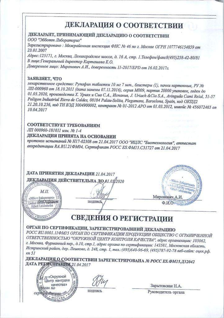 Применение. Таблетки Рупафин можно принимать независимо от приема пищи. Стандартная доза для взрослых и детей старше 12 лет составляет 10 мг один раз в день. Длительность приема устанавливается врачом индивидуально, в зависимости от клинического ответа на лечение.
