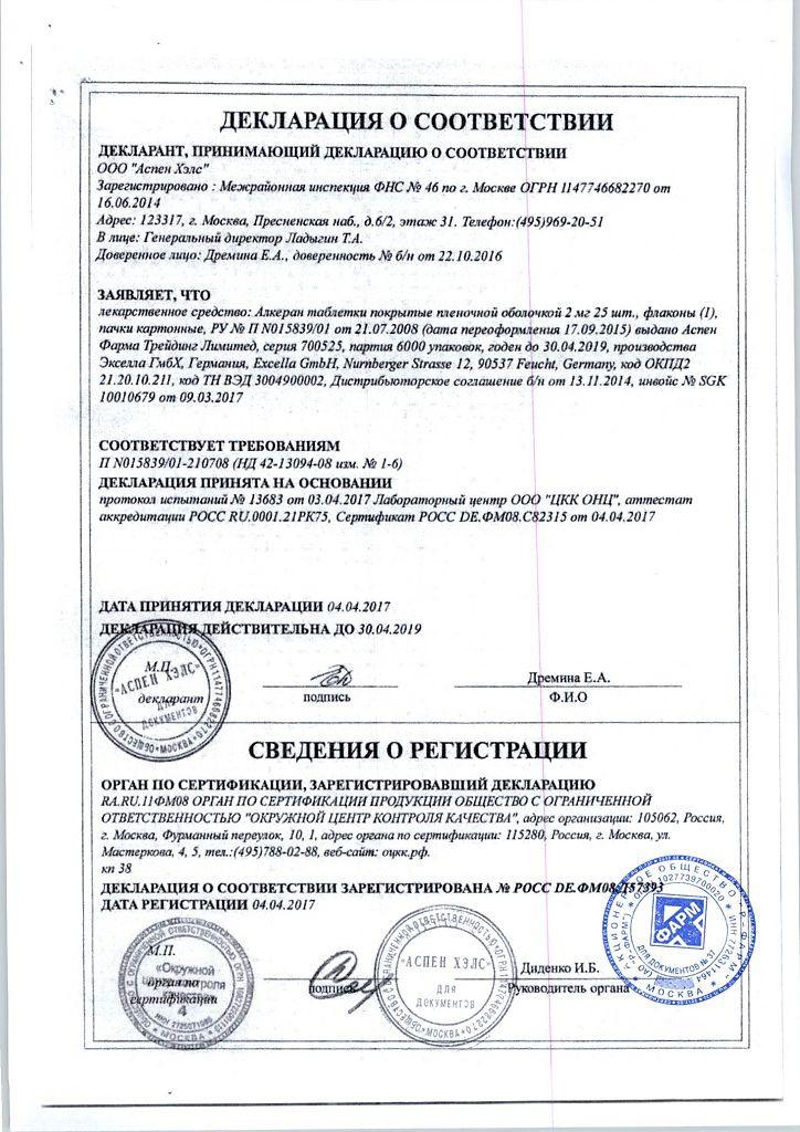 Принцип действия Алкерана заключается в сложном воздействии на раковые клетки, ведущем к подавлению их репликации (деления). Алкеран активно поражает не только активно делящиеся раковые клетки, но и клетки, находящиеся в состоянии покоя.