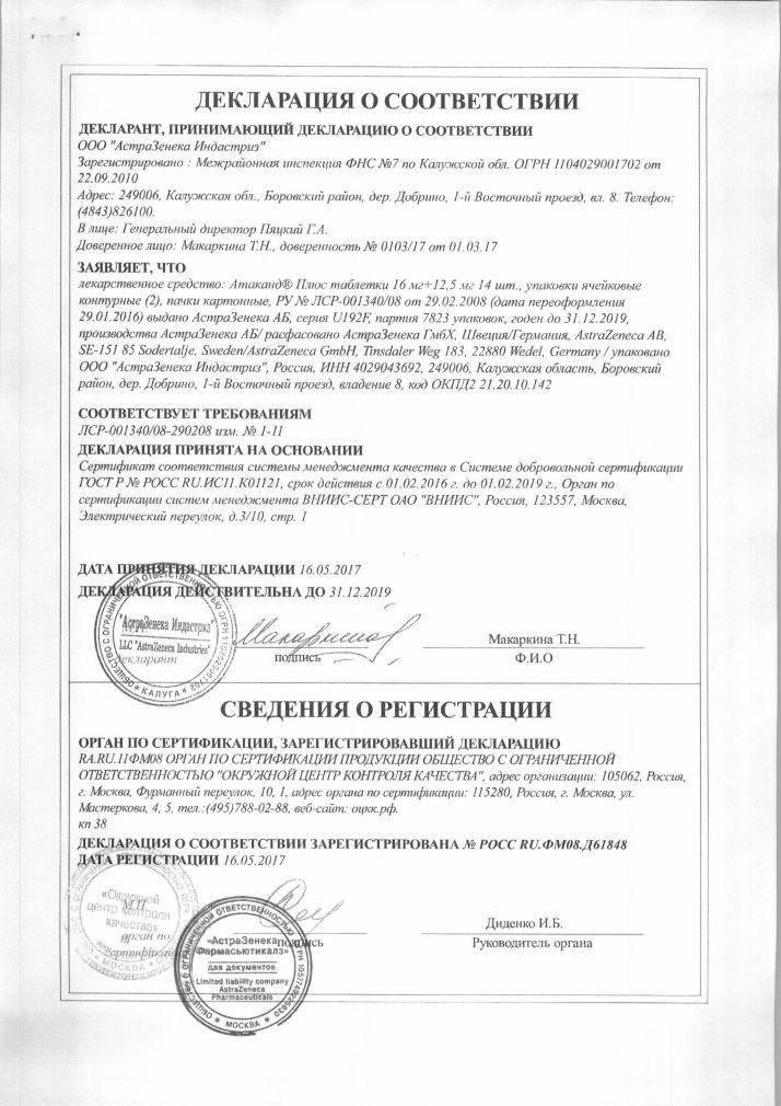 Применение. Таблетки Атаканд Плюс принимают внутрь, вне зависимости от приема пищи. Рекомендуемая доза — 1 табл. 1 раз в сутки.