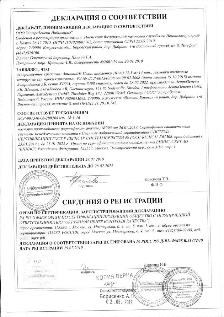 1 таблетка Атаканд содержит активного вещества кандесартана цилексетила 16 мг.