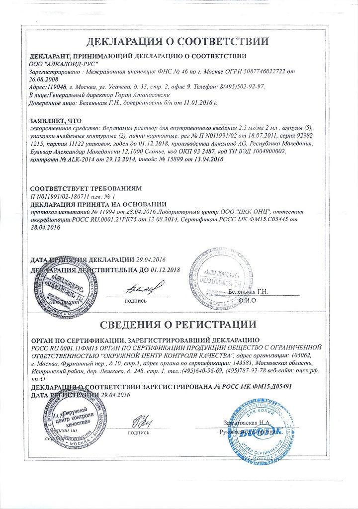 Активное вещество: верапамила гидрохлорид 2,5 мг в 1 мл.