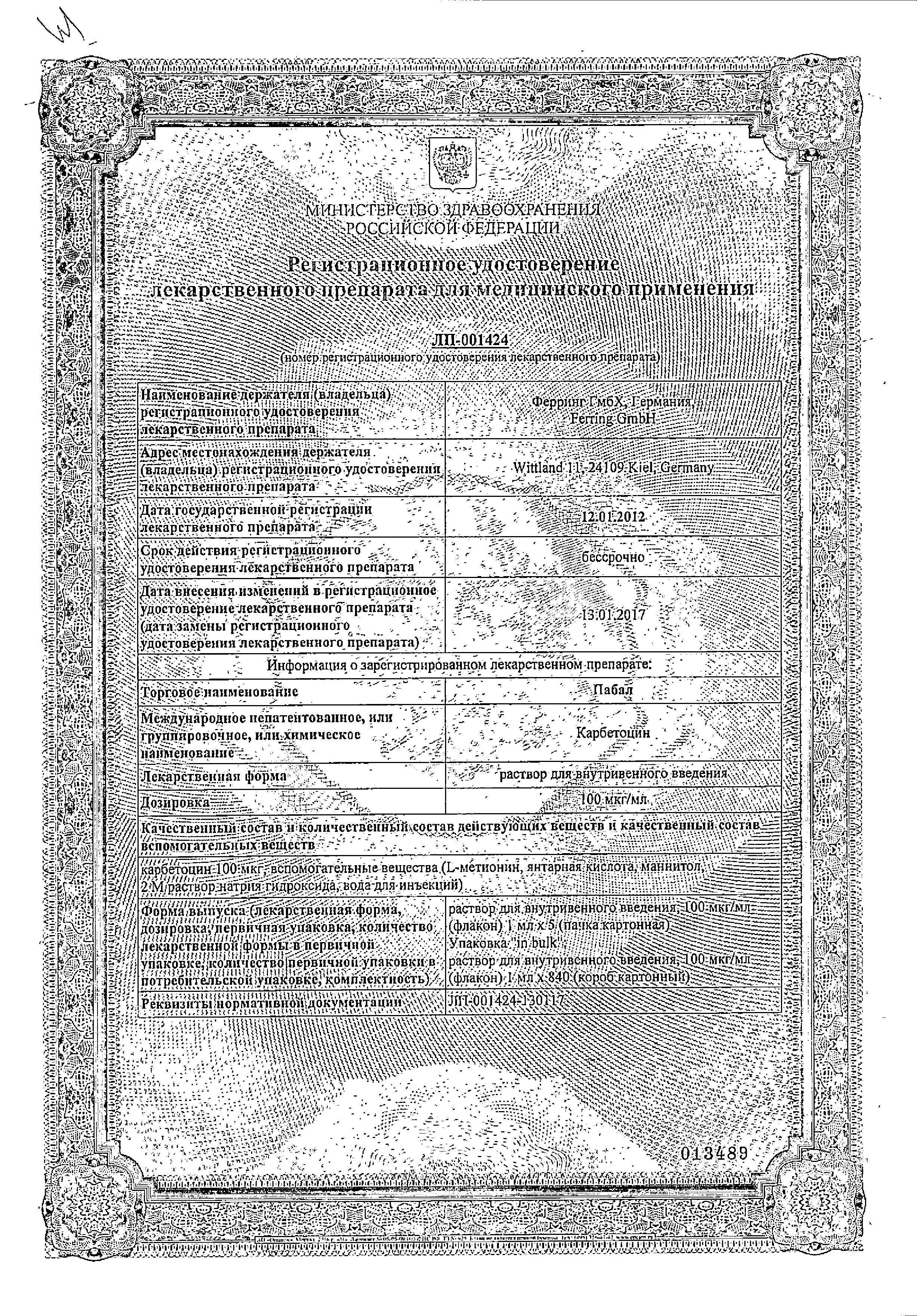 Пабал является агонистом окситоцина длительного действия. Карбетоцин избирательно связывается с рецепторами окситоцина в гладкой мускулатуре матки, стимулирует ритмичные сокращения матки, увеличивает частоту имеющихся схваток и повышает тонус маточной мускулатуры. В послеродовой матке карбетоцин увеличивает скорость и силу спонтанных маточных сокращений. После введения карбетоцина сокращения матки учащаются, и через 2 минуты наступает резкая схватка.
